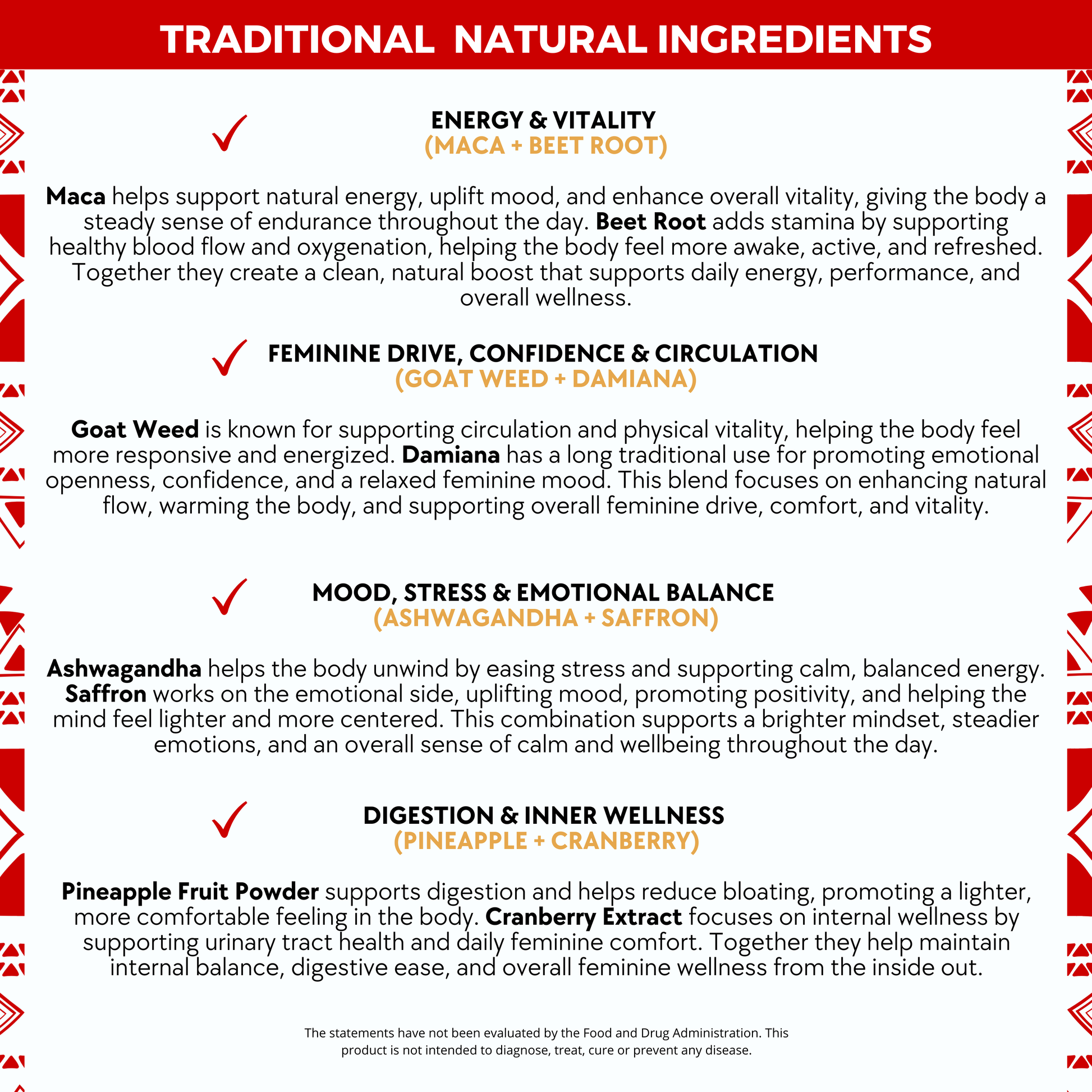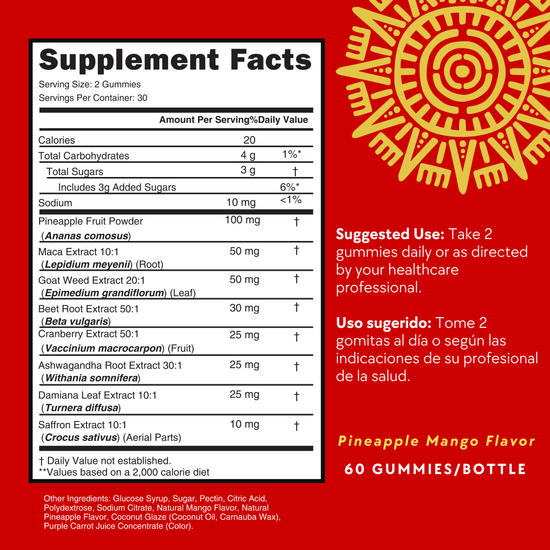 These delicious pineapple-mango gummies are infused with powerful botanicals traditionally used to boost libido, increase desire, enhance circulation, elevate mood, and reignite feminine fire.