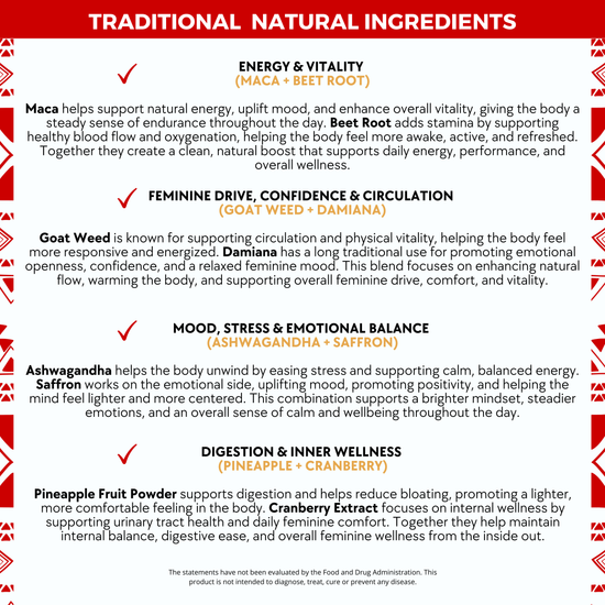 Known for supporting libido, stamina, and sexual energy. Maca helps increase desire, endurance, and overall vitality while supporting hormonal balance.